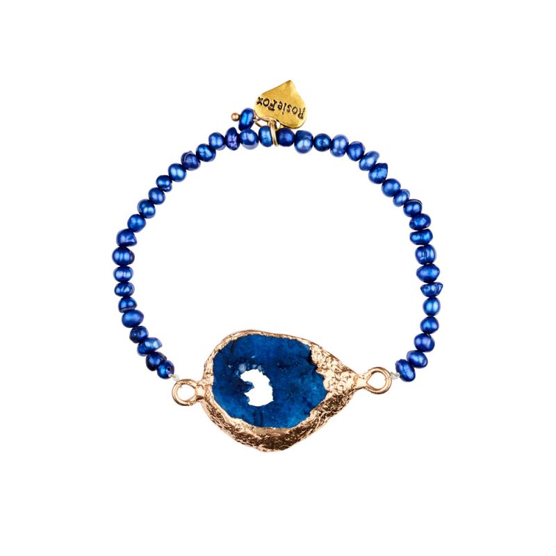 A beautiful, semi-precious bracelet, handcrafted with blue cobalt and natural agate rock, adorned with blue pigmented, freshwater pearls.