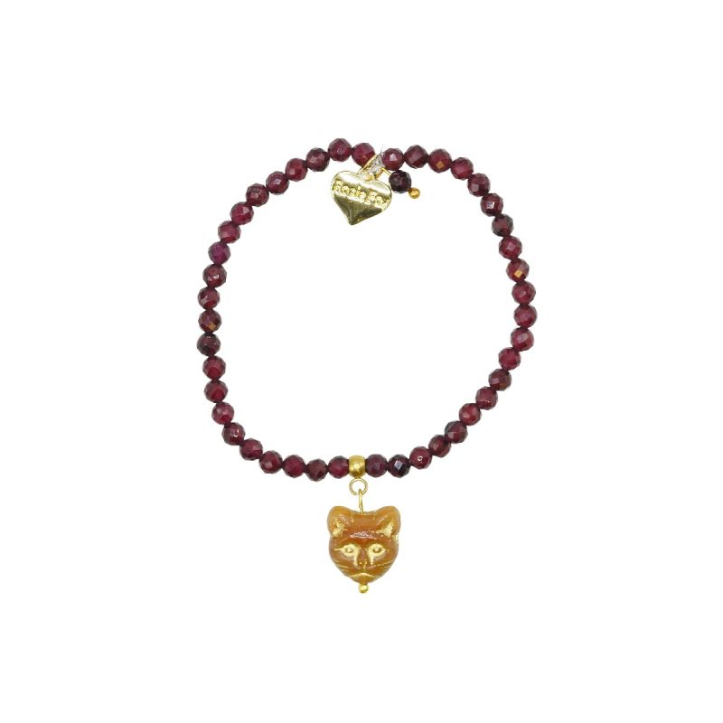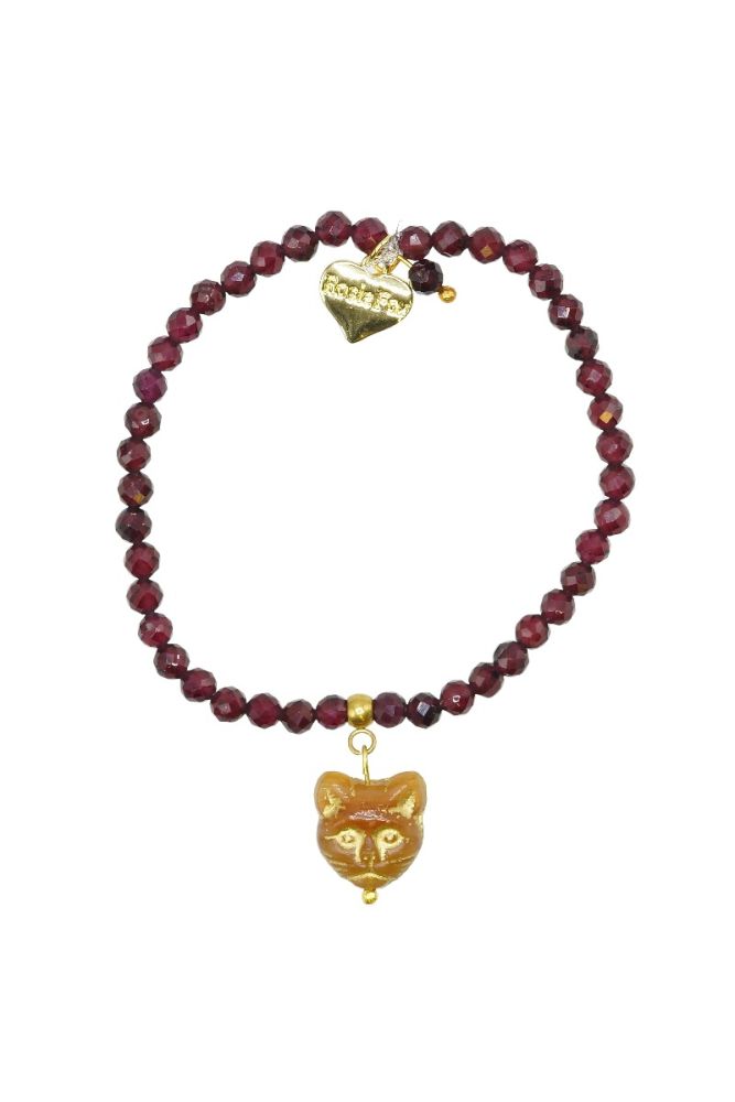 Designed especially for all the cat lovers in the world, handmade in Herefordshire this stunning 14ct Gold plated, semi-precious, stretch bracelet is made from deep red Garnet gemstone crystals. The gemstones are approx 4mm each and faceted to give extra sparkle when the light hits them.