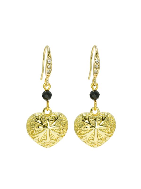 These stunning Gold Hearts and Black Spinnel Crystal Earrings are handmade in the UK, they are crafted with beautiful Black Spinnel gemstone beads. They are hypoallergenic and made from 18ct Gold plated hooks which are embellished with sparkling crystals.