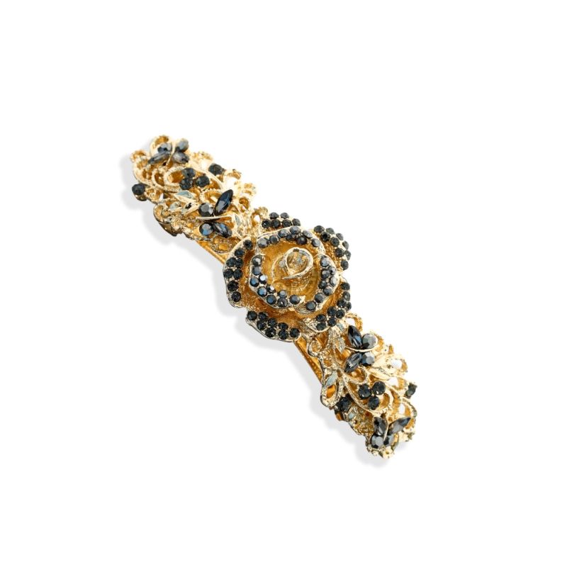 An elegant sparkling barrette hair clip, set onto an gold background with a gorgeous floral design and hand embellished with sparkling black and iridescent crystals. This hair accessory that will add a touch of elegance to any outfit!