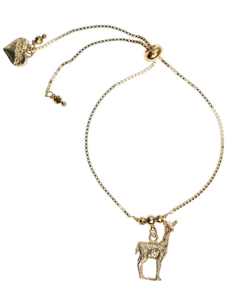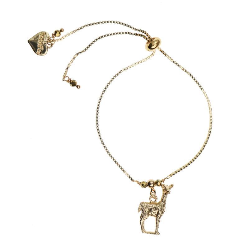 This stunning adjustable 14ct Gold plated chain bracelet is hand made with three semi-precious Pyrite faceted beads and is accessorised with a gorgeous Gold plated Red Deer charm and Rosie Fox heart charm.
