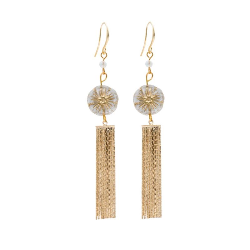 Designed and handmade in Herefordshire these stunning 24ct Gold plated, semi-precious tassel earrings are made from Gold Rutilated Quartz crystals. The gemstones are 3mm each and faceted to give extra sparkle when the light hits them.