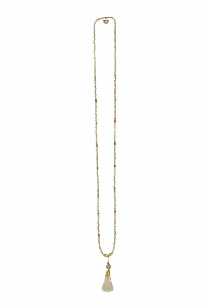 This beautiful long, gemstone necklace is handmade with a stunning pale white and gold 'Belle' flower tassel. Measuring approx 47cm drop and it is finished with my signature 14ct Gold plated Rosie Fox heart charm.