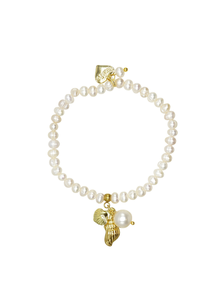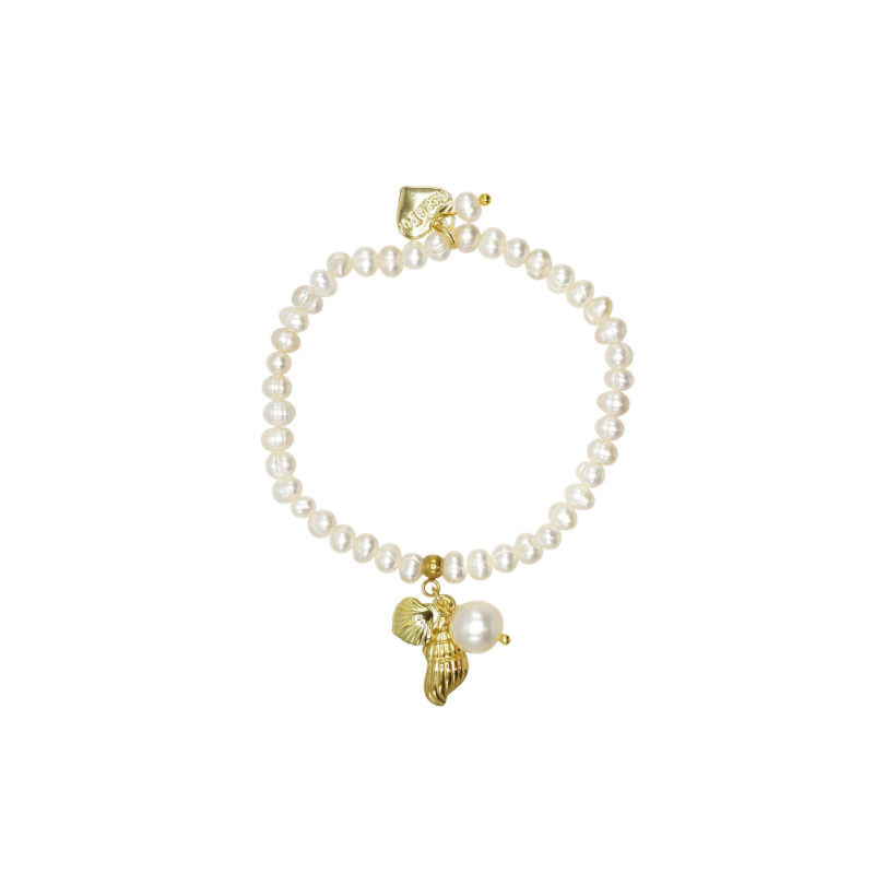 This gorgeous bracelet has a stunning 1cm Freshwater Pearl and two 18ct Gold plated shell charms with my signature 14ct Gold plated Rosie Fox heart charm.