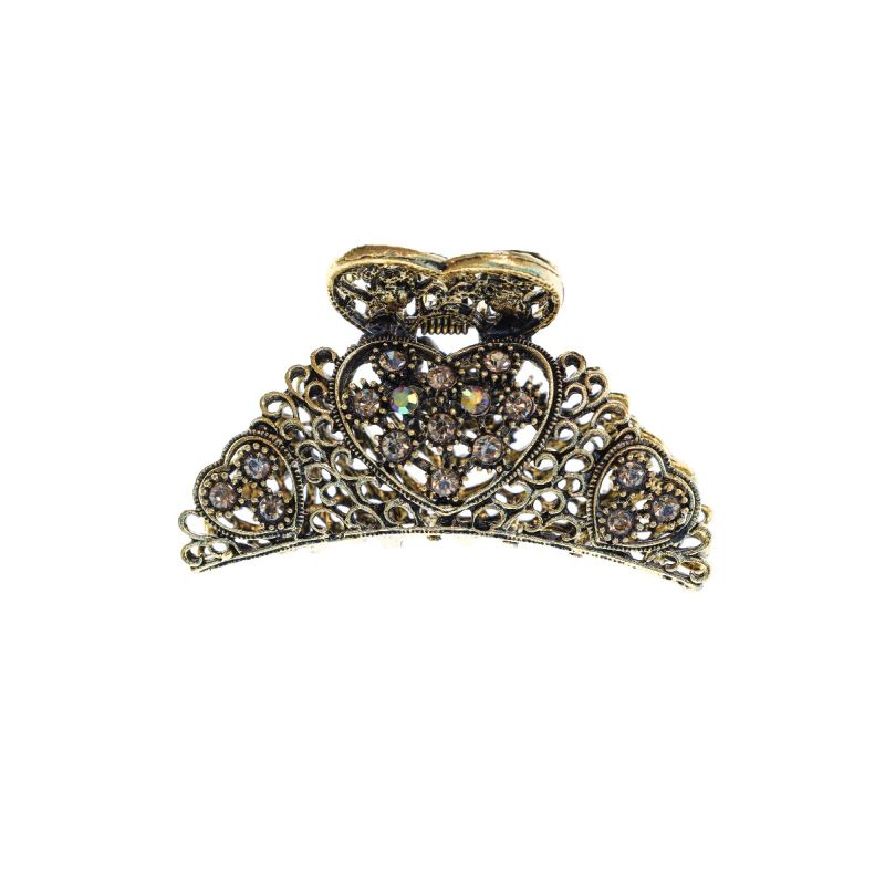 This beautiful gold jaw clip has a subtle heart shaped design and is embellished with sparkling smoky grey crystals. This hair accessory will add a gorgeous, elegant touch to any outfit.