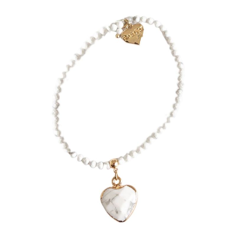 This stunning stretch bracelet is handmade using white Howlite beads and is accessorised with a gorgeous Gold plated semi-precious white Howlite heart charm and the signature Rosie Fox Gold plated charm.