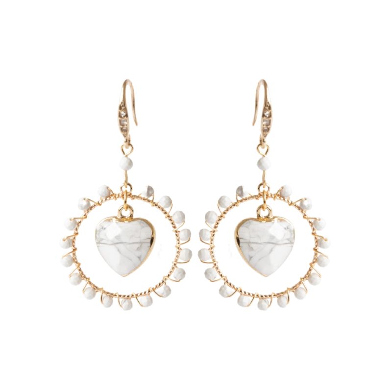 These statement Howlite heart hand finished hoop earrings feature white Howlite beads and a gorgeous Gold plated semi-precious white Howlite heart.