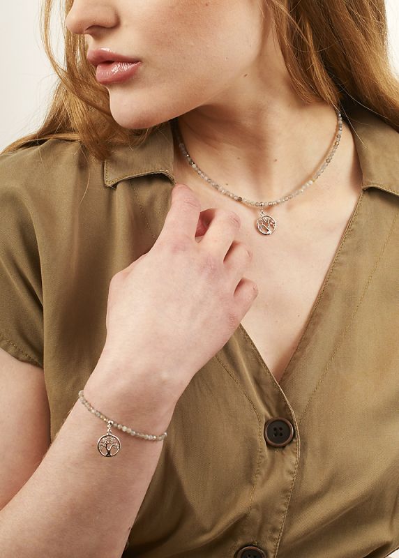 This is a gorgeous, handmade Silver plated Tree of Life charm necklace with Labradorite beads.