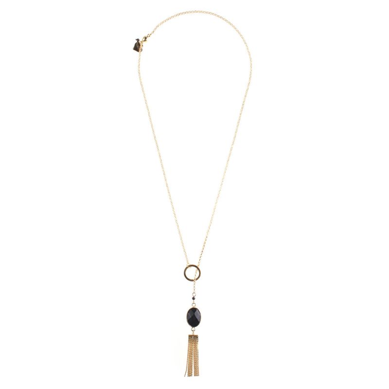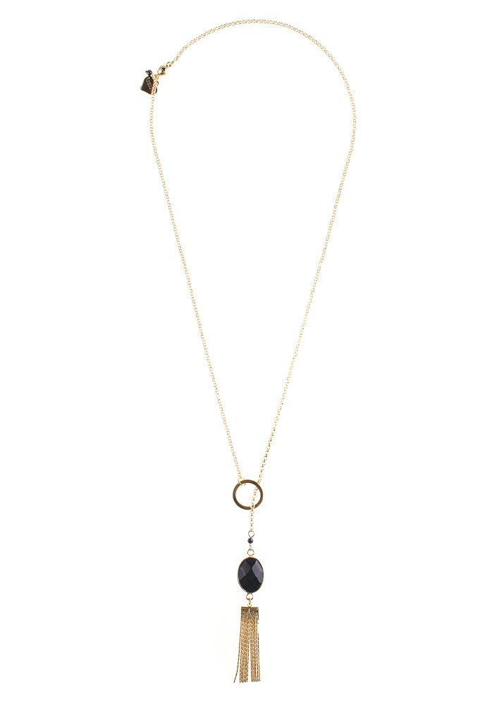 This Stunning 14 carat gold plated Magnetite Gemstone Tassel Lariat Necklace is the perfect addition to any look.