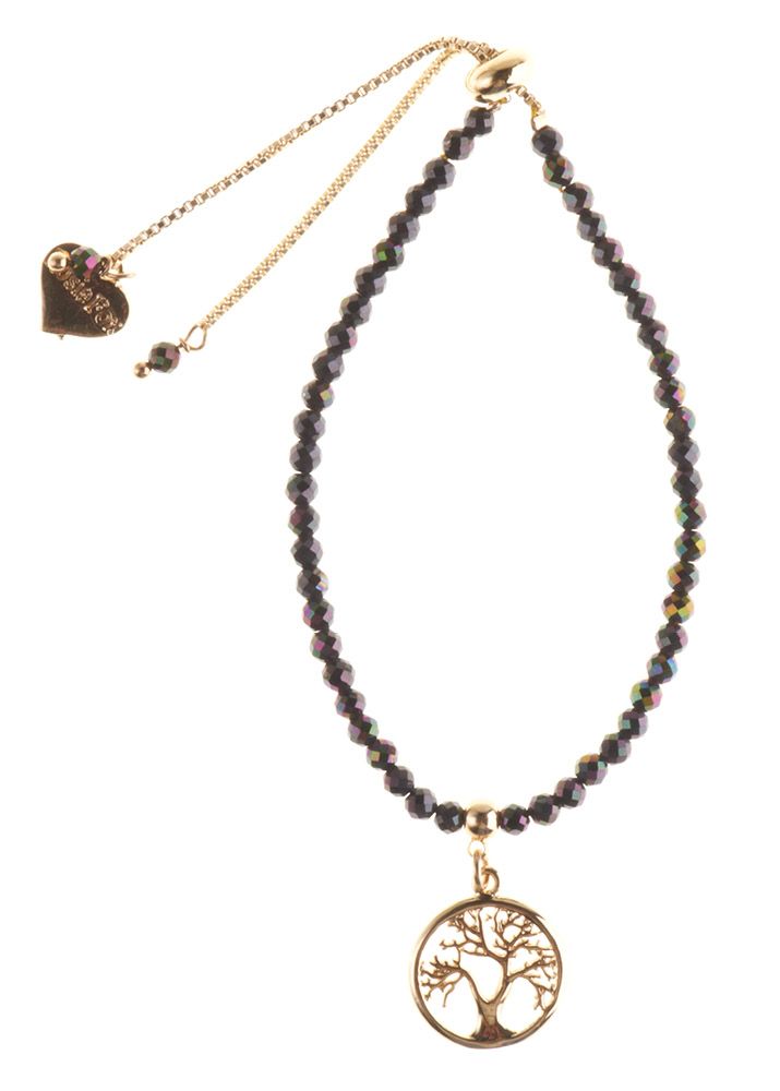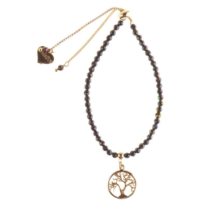 A beautiful Magnetite gemstone bracelet adorned with a 14 carat gold plated Tree of Life charm symbolising positive energy, good health and bright future, finished with a gold plated signature Rosie Fox heart charm.