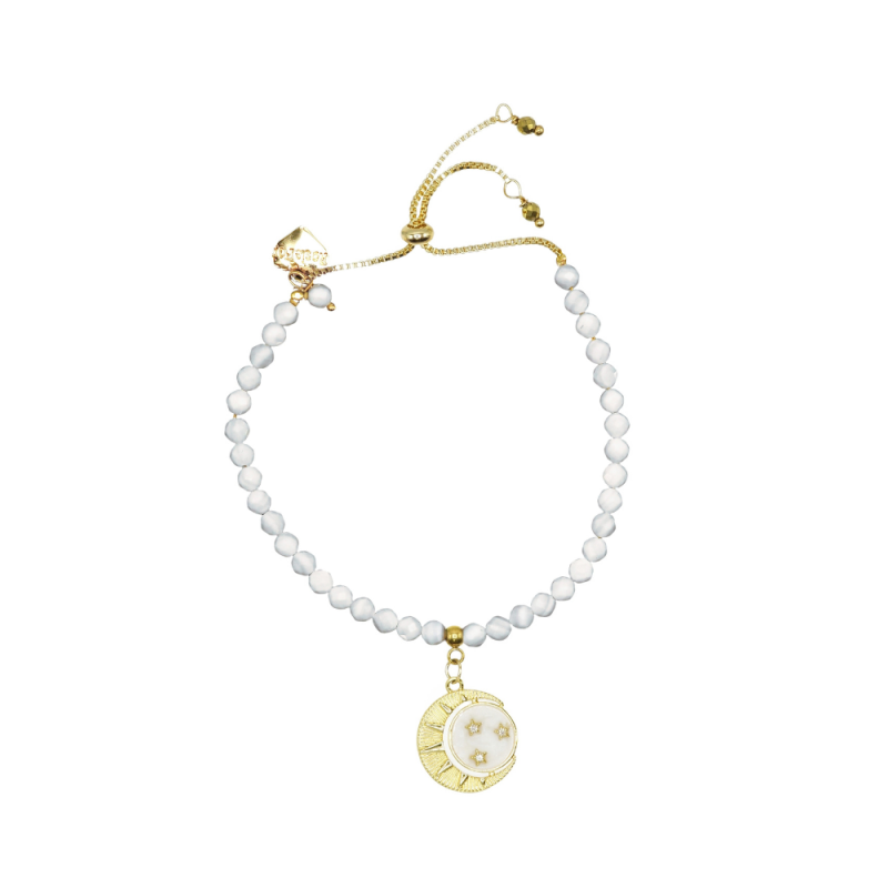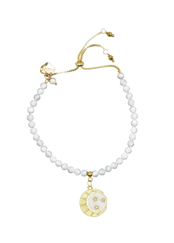 Designed and handmade in Herefordshire this stunning 18ct Gold plated, semi-precious, adjustable bracelet is made from white Mother Of Pearl beads.This beautiful handmade bracelet has the stunning 18ct gold plated New Moon,Sun and Stars and my signature 14ct Gold plated Rosie Fox heart charm.