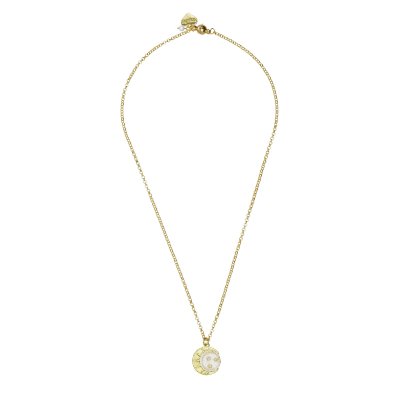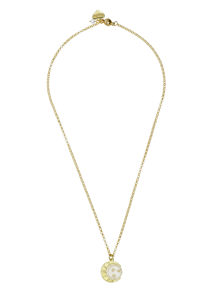 Designed and handmade in Herefordshire this beautiful 14ct Gold plated necklace lies perfectly adoring your neckline. There is a beautiful white Mother Of Pearl beads and the stunning 18ct gold plated New Moon,Sun and Stars.