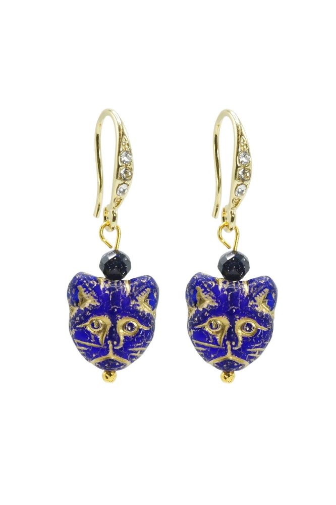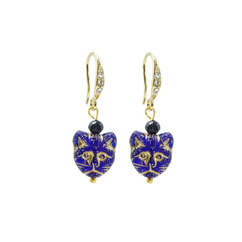 These beautiful handmade earrings with their stunning, blue, crystal, cat heads measure approx a 2.5cm drop, with 14ct Gold plated with crystal, french earring hooks.