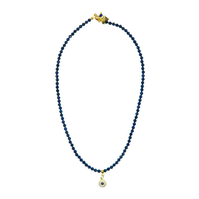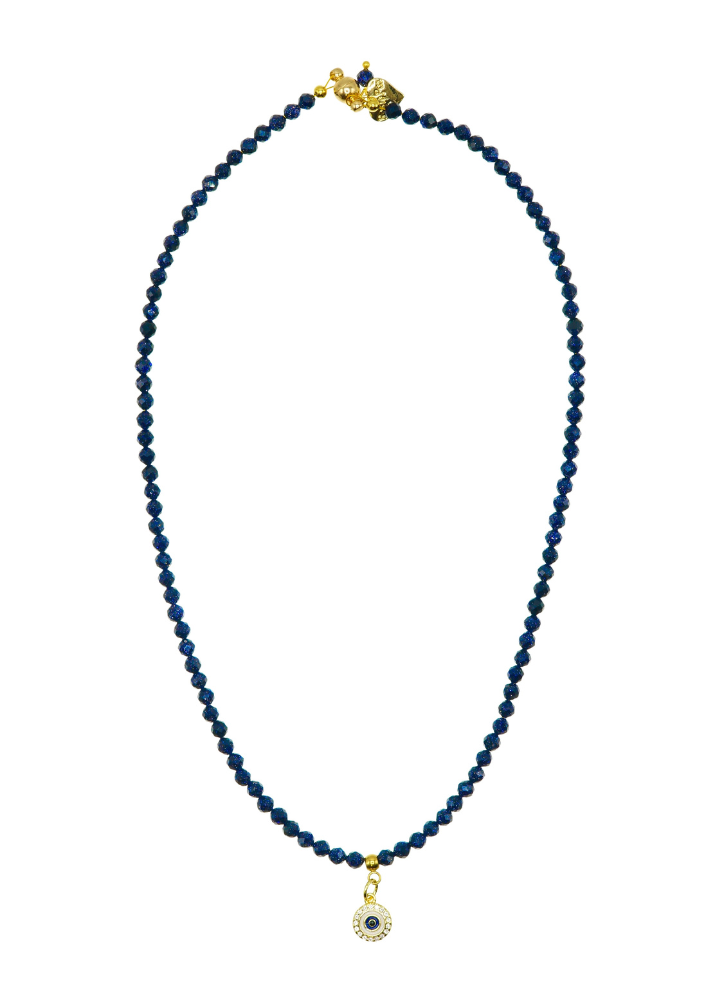 Designed and handmade in Herefordshire this stunning 14ct Gold plated,semi-precious necklace is made from gorgeous Navy Starstone Gemstone crystals and the stunning Protective Eye. The gemstones are approx 4mm each and faceted to give extra sparkle when the light hits them.