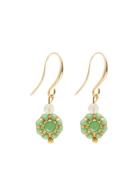 Designed and handmade in Herefordshire, these stunning Gold plated, semi-precious earrings are made from pale green Prehnite gemstone crystals and beautiful with tradional Bohemian glass, pale green and gold 'Belle' flower shape beads. The gemstones are 3mm each and faceted to give extra sparkle when the light hits them.