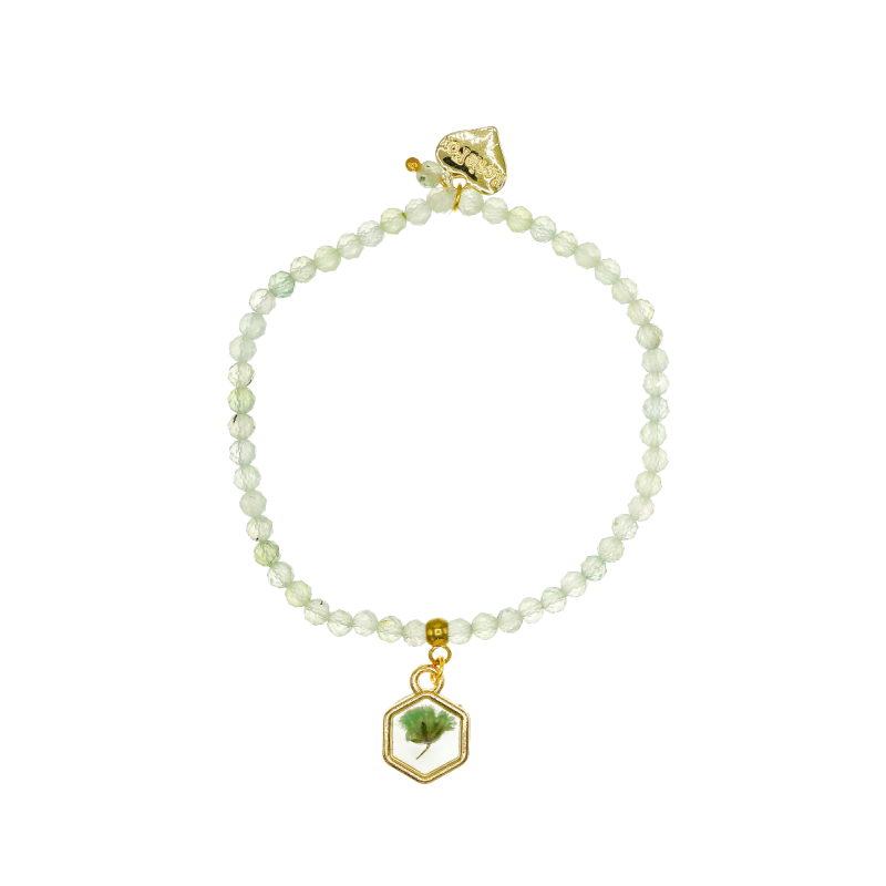 Designed and handmade in Herefordshire this stunning 14ct Gold plated, semi-precious bracelet is made from pale green Prehnite gemstone crystals. The gemstones are approx 4mm each and faceted to give extra sparkle when the light hits them.