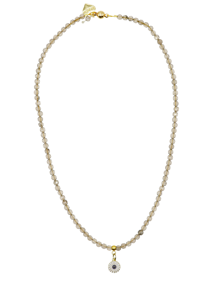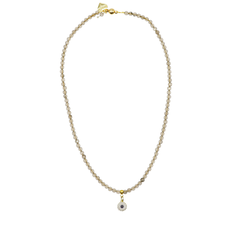 Designed and handmade in Herefordshire this stunning 14ct Gold plated,semi-precious necklace is made from sparkling Ice Obsidian gemstone beads which sparkle with an iridescent taupe colour and a stunning Protective Eye Crystal charm. It is finished using a strong gold magnet clasp with my signature 14ct Gold plated Rosie Fox heart charm.