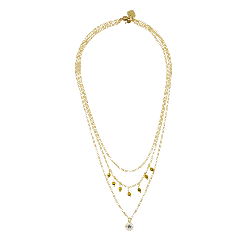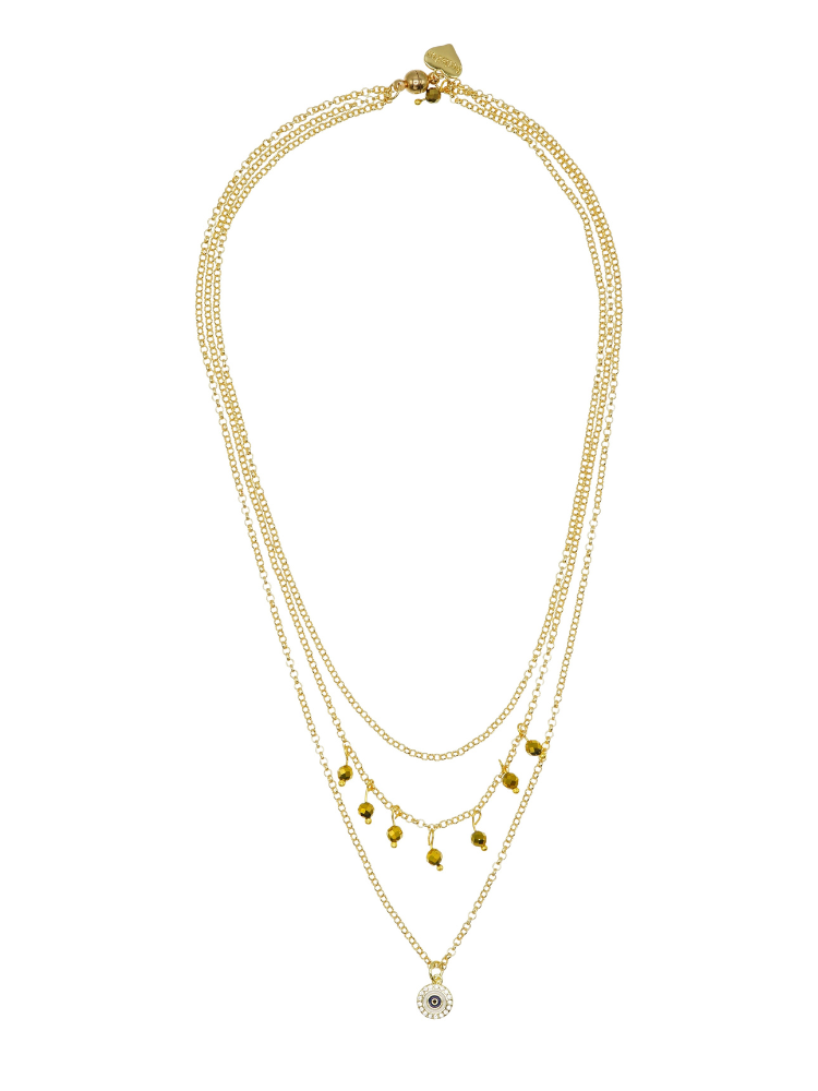 This beautiful 18ct Gold plated chain necklace has three layers and lies perfectly adoring your neckline. There are gorgeous gold Pyrite Gemstone crystals elegantly falling from the centre layer and the stunning Protective Eye, crystal charm finishes the necklace on the lowest layer.