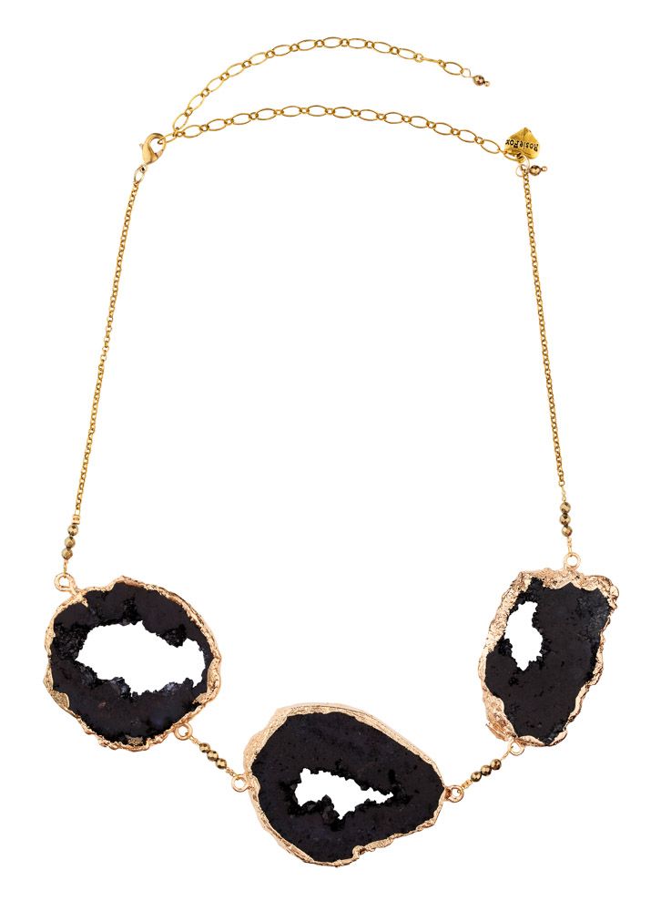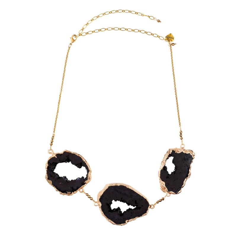 A stunning, semi-precious necklace, featuring natural black agate rock hightlighted with gleaming, gold pyrite detailing. The natural rock in this piece is inspired by nature and the earth's magnificient elements.