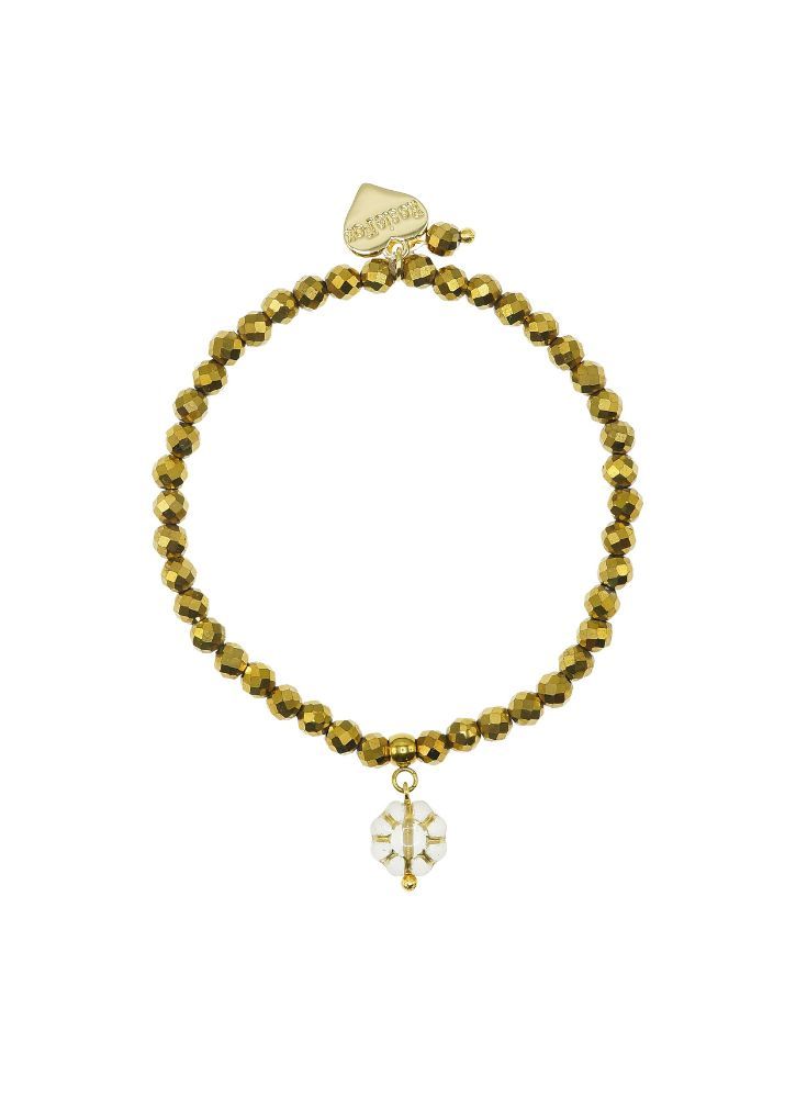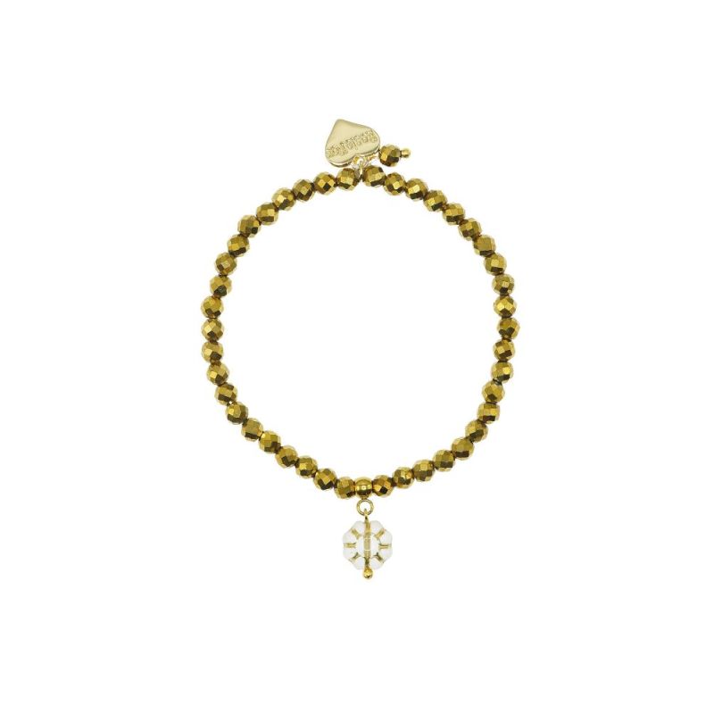 Designed and handmade in Herefordshire this stunning 14ct Gold plated, semi-precious, stretch bracelet is made from beautiful Pyrite gemstone crystals. The gemstone beads are approx 4mm each and faceted to give extra sparkle when the light hits them.