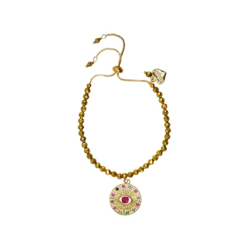 This beautiful handmade bracelet has a stunning Fuchsia Crystal Eye charm and my signature 14ct Gold plated Rosie Fox heart charm.