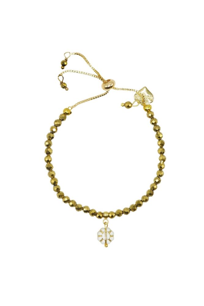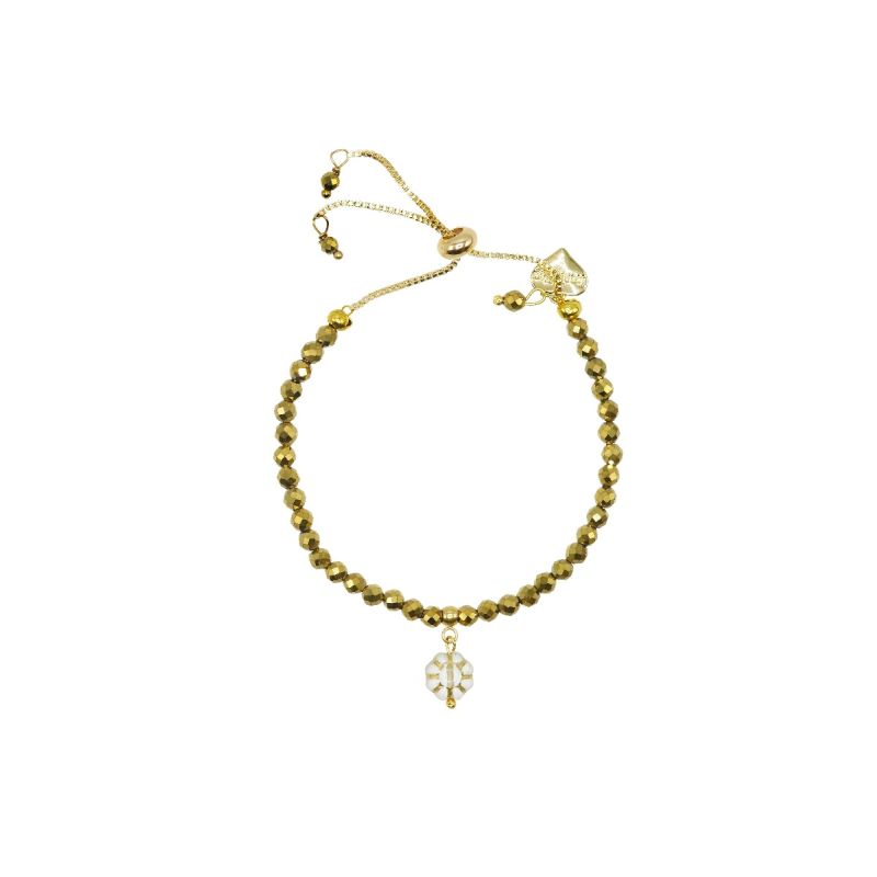 Designed and handmade in Herefordshire this stunning 14ct Gold plated, semi-precious, adjustable bracelet is made from beautiful Pyrite gemstone crystals. The gemstone beads are approx 4mm each and faceted to give extra sparkle when the light hits them.