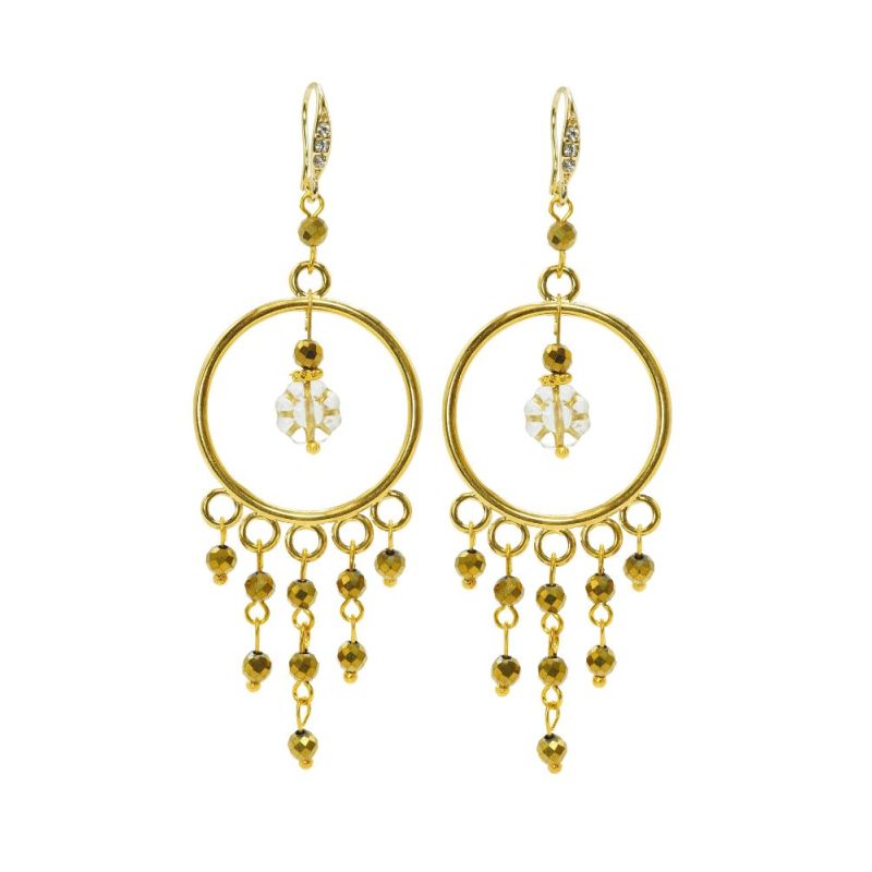 Designed and handmade in Herefordshire, these stunning Gold plated, semi-precious, statement chandelier earrings are made from Pyrite gemstone crystals with a beautiful Bohemian crystal and gold 'Belle' flower shape bead. They are the perfect statement accessory and the Pyrite gemstones are approx 4mm each and faceted to give extra sparkle when the light hits them.