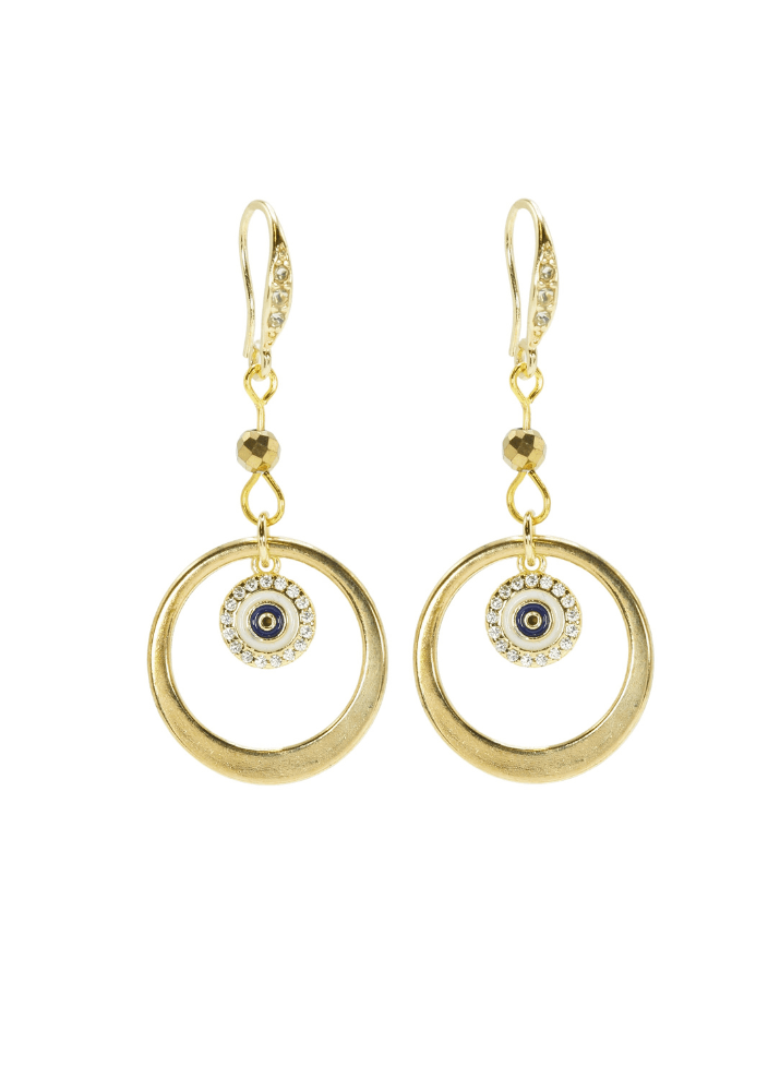 These stunning Protective Eye 18ct Gold plated earrings are handmade in the UK, embellished with faceted sparkling taupe colour, Pyrite gemstone beads and crystals.
