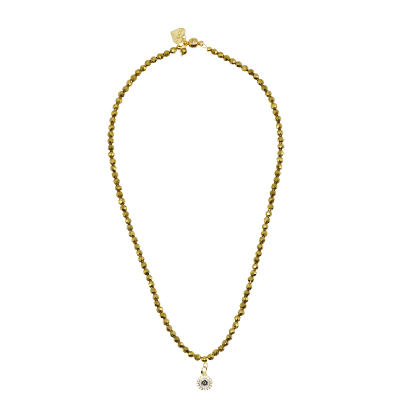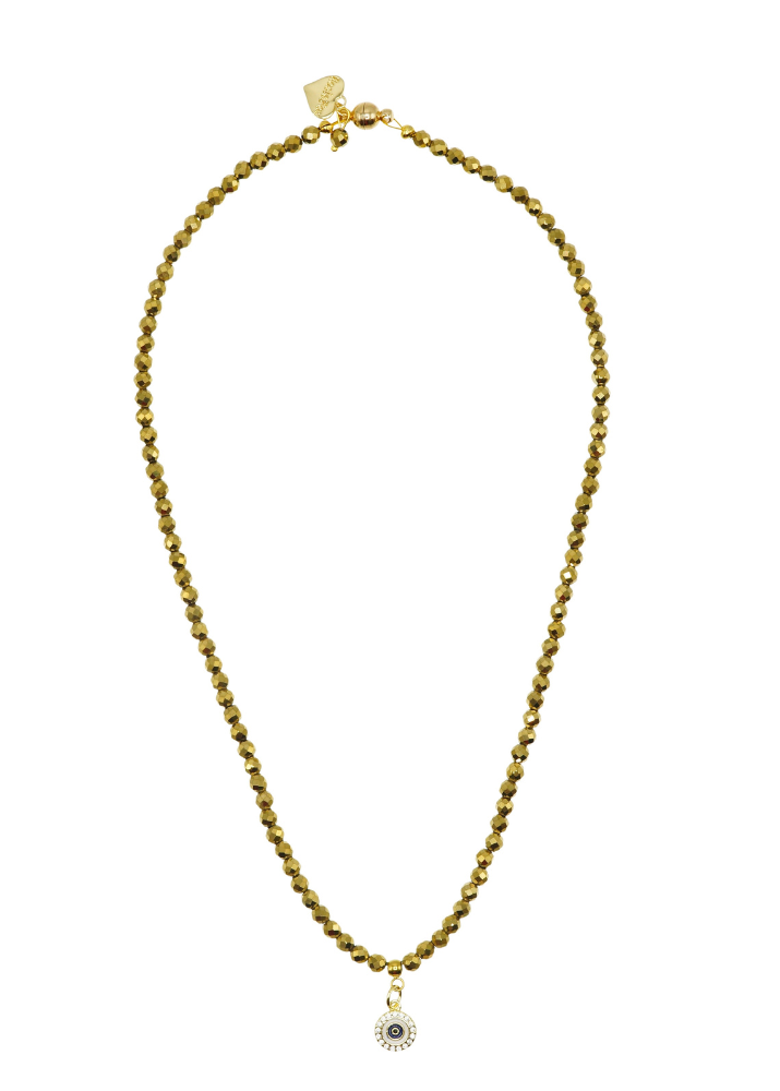 Designed and handmade in Herefordshire this stunning 14ct Gold plated,semi-precious necklace is made from beautiful Pyrite gemstone crystals and a stunning Protective Eye Crystal charm. It is finished using a strong gold magnet clasp with my signature 14ct Gold plated Rosie Fox heart charm.