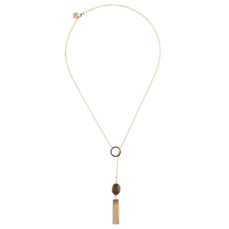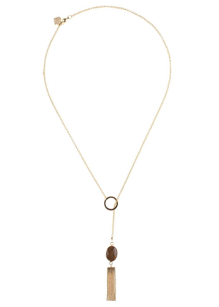 This Stunning 14 carat gold plated Pyrite & Tiger's Eye Gemstone Tassel Lariat Necklace is the perfect addition to any look.