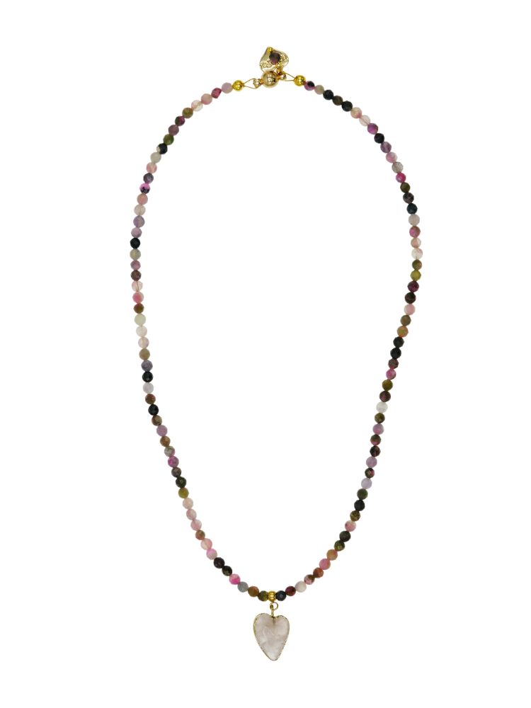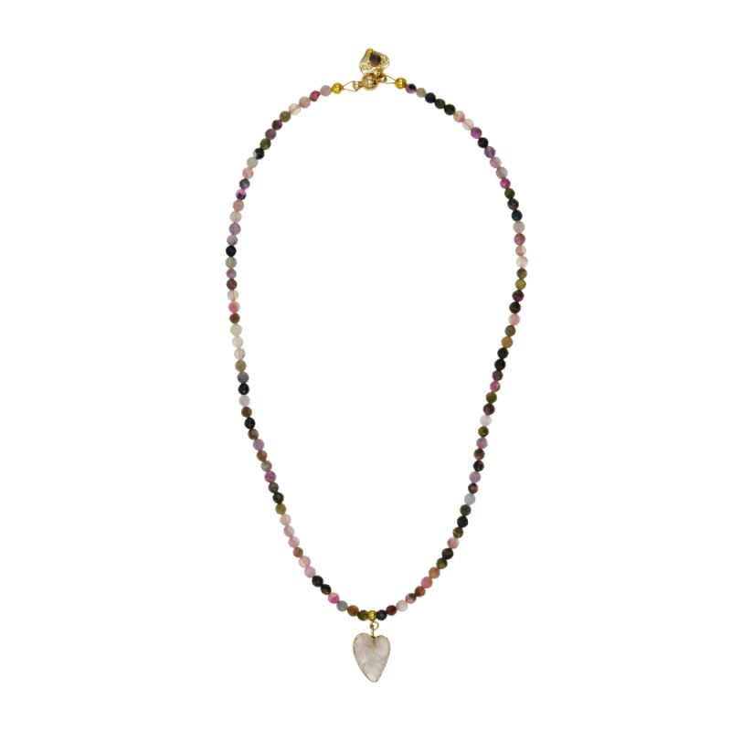 Designed and handmade in Herefordshire this stunning 14ct Gold plated,semi-precious necklace is made from beautiful Tourmaline gemstone crystals and a stunning Rose Quartz Heart. It is finished using a strong gold magnet clasp with my signature 14ct Gold plated Rosie Fox heart charm.