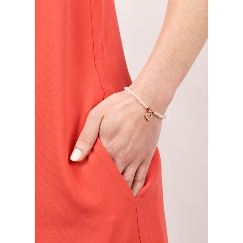 A charming bracelet, handmade with gemstone beads, adorned with a beautiful, crystal encrusted heart charm. With delicate soft tones, this stylish accessory will compliment any outfit, adding a touch of femininity to your look, whilst the ruby red beads add a vibrant pop of colour. You will truly fall in love with this gorgeous bracelet!