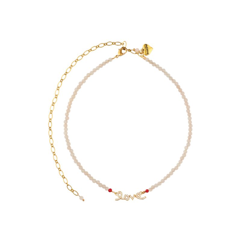 A charming necklace, handmade with gemstone beads, adorned with a gold, crystal encrusted 'love' pendant. With delicate soft tones, this stylish accessory will compliment any outfit, adding a touch of femininity to your look, whilst the ravishing ruby red beads add a beautiful pop of colour. You will truely fall in love with this gorgeous necklace.