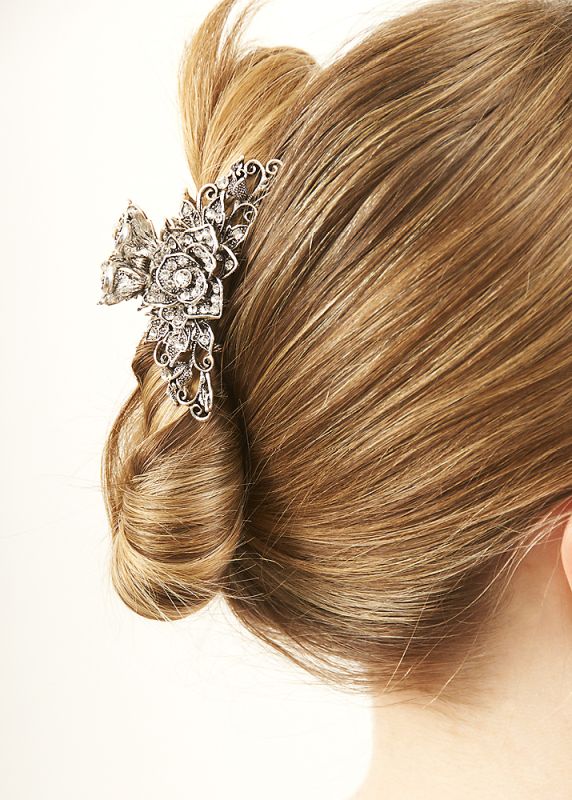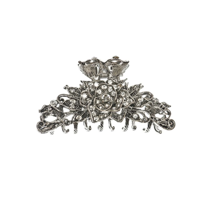 This is a lovely Silver Elegant Rose Jaw Clip with crystal embellishments. This is a hair accessory that will add a gorgeous, elegant touch to any outfit.