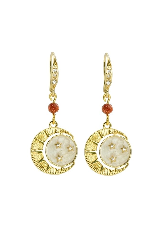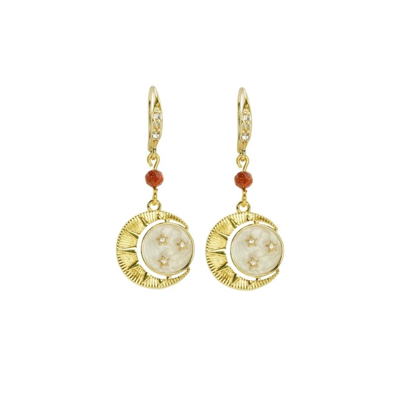 These stunning New Moon,Sun and Stars earrings are handmade in the UK, they are crafted with beautiful Sunstone crystals. They are hypoallergenic and made from 18ct Gold plated hooks which are embellished with sparkling crystals.