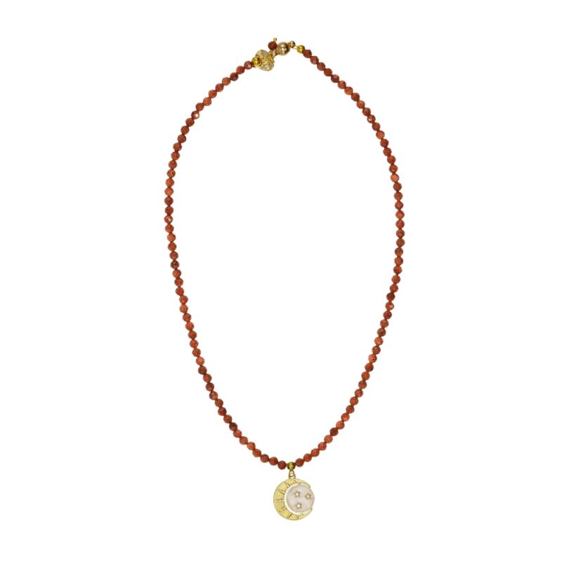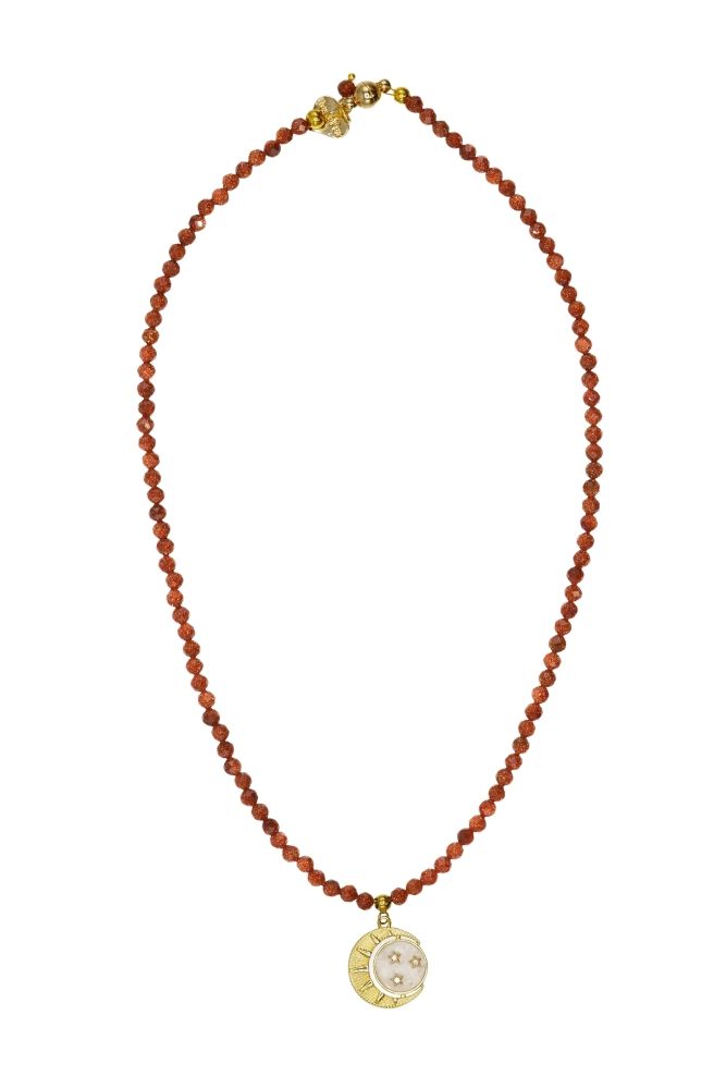 Designed and handmade in Herefordshire this stunning 14ct Gold plated,semi-precious necklace is made from beautiful Sunstone crystals and the stunning 18ct gold plated New Moon,Sun and Stars. It is finished using a strong gold magnet clasp with my signature 14ct Gold plated Rosie Fox heart charm.